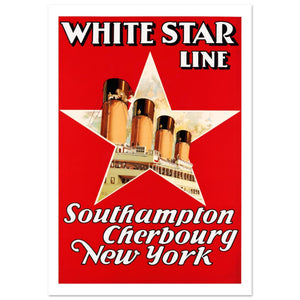 This bold and striking poster from White Star Line showcases the iconic red funnels of its luxury ocean liners. The image centers on a large star framing the ship, symbolizing its prominence in transatlantic travel. The text emphasizes key departure points, including Southampton, Cherbourg, and New York, representing the essential route for travelers seeking premium voyages across the Atlantic. This artwork captures the glamour and elegance associated with the White Star Line, renowned for vessels like the Titanic.
